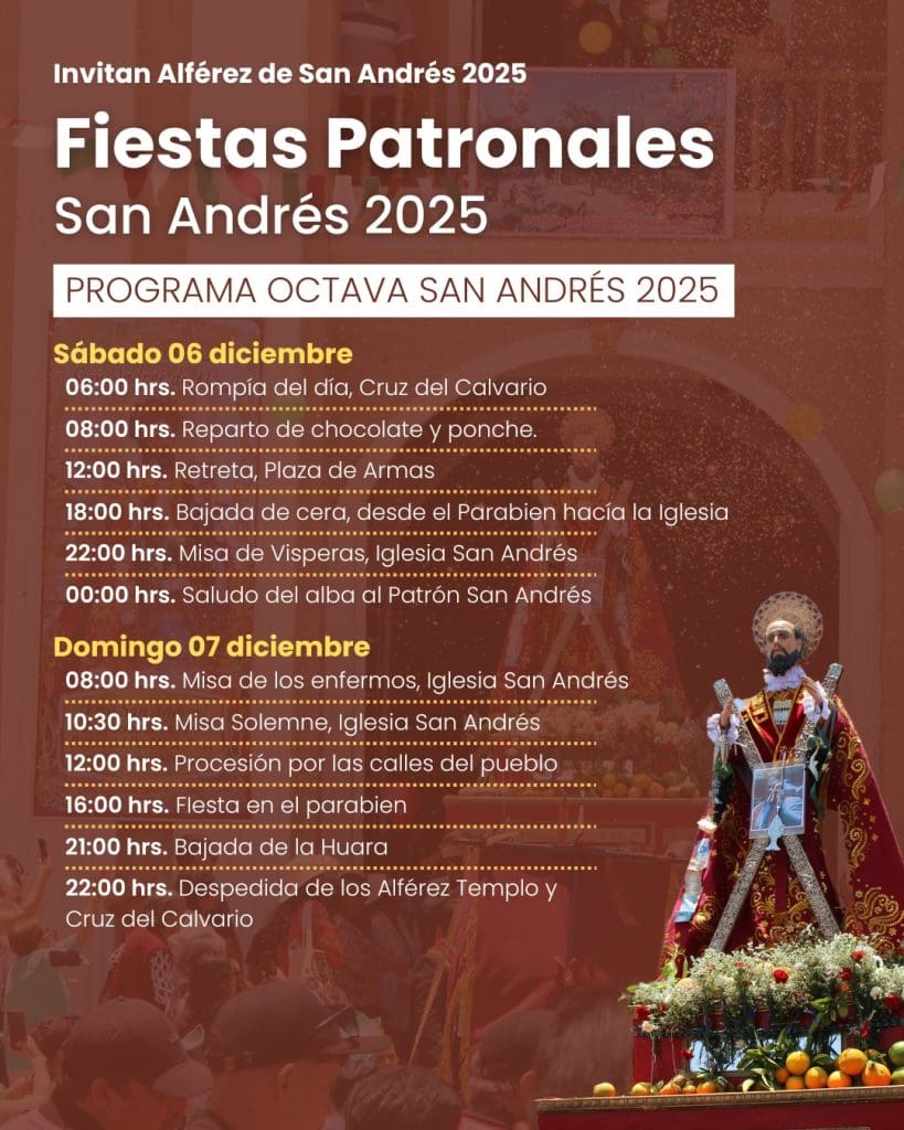 El programa continuará el sábado 6 de diciembre con la Rompía del día (06:00 horas) y el reparto de chocolate y ponche (08:00 horas). La jornada incluirá la Misa de Vísperas y el Saludo del alba al Patrón San Andrés a medianoche.