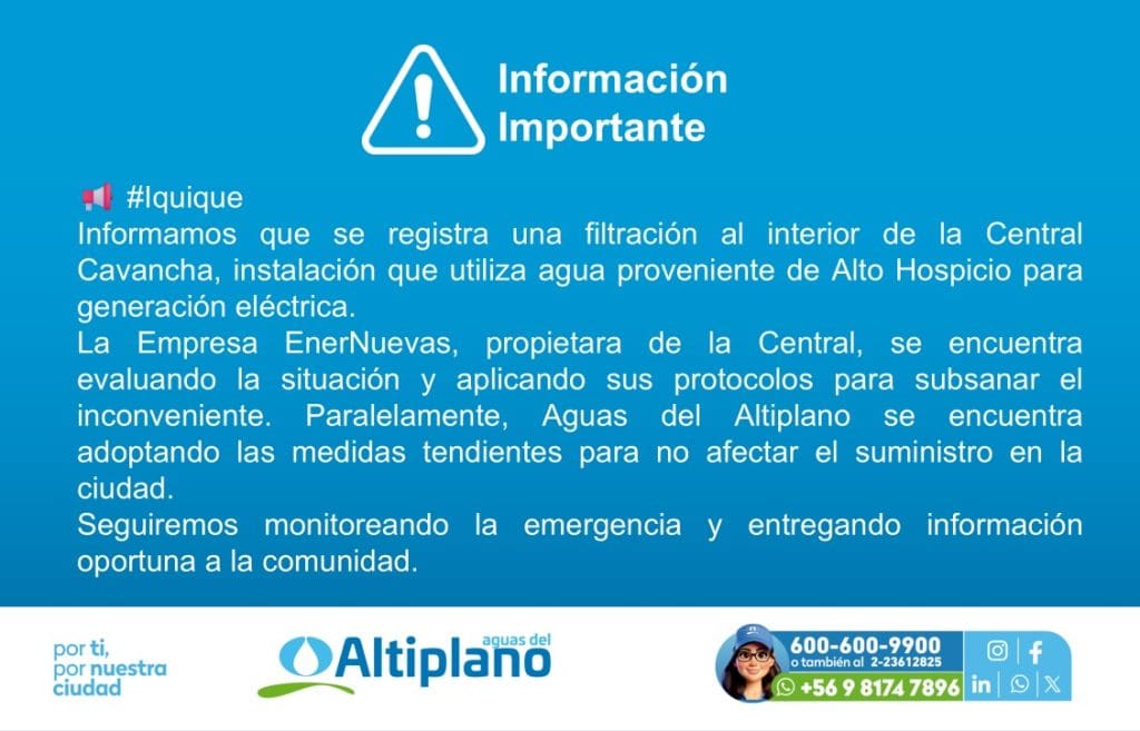 Posteriormente, mediante un comunicado oficial, Aguas del Altiplano informó que la filtración se produjo al interior de la Central Cavancha y que la empresa responsable se encuentra evaluando la situación y aplicando sus protocolos para subsanar el inconveniente. En paralelo, la sanitaria señaló que está adoptando las medidas necesarias para evitar afectaciones al suministro de agua potable en la ciudad.