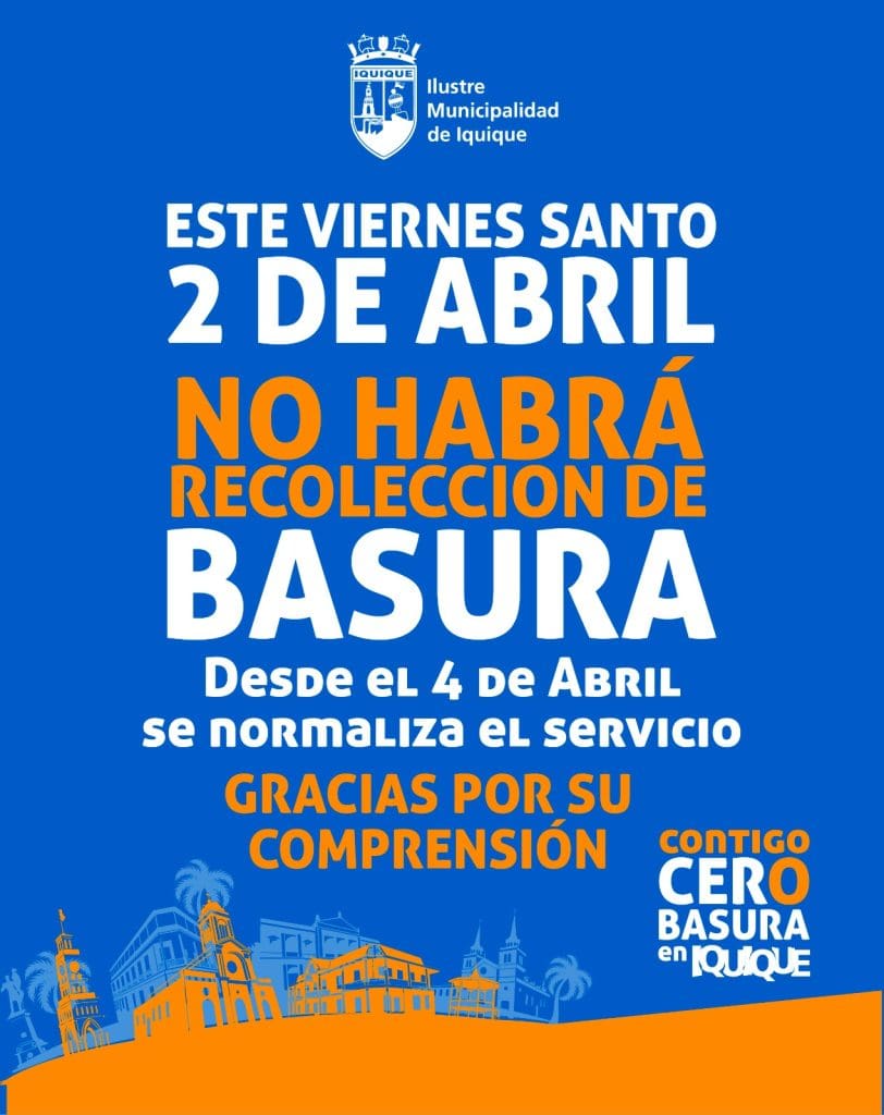 La Ilustre Municipalidad de Iquique ha confirmado que este Viernes Santo, 2 de abril, NO habrá recolección de basura en toda la comuna. Esta medida implica que los vecinos no deben sacar sus desechos a la calle durante esa jornada.