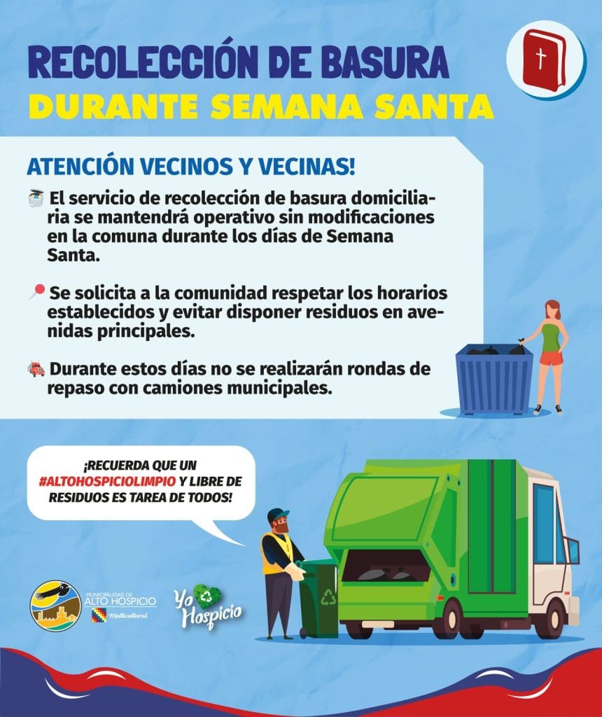 Por su parte, la Municipalidad de Alto Hospicio ha informado un plan distinto. El servicio de recolección de basura domiciliaria se mantendrá operativo sin modificaciones en la comuna durante todos los días de Semana Santa, incluyendo el viernes festivo.