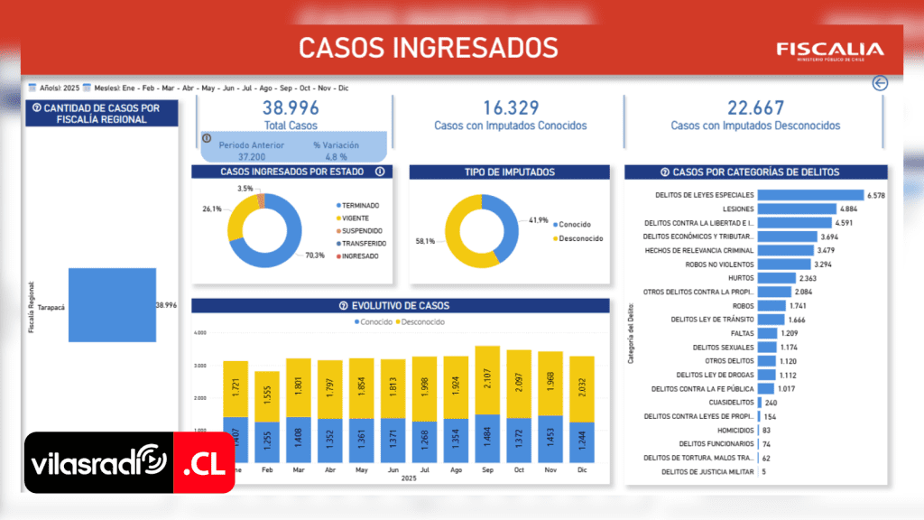 Según las cifras del Boletín Estadístico 2025 del Ministerio Público, la Región de Tarapacá se consolidó como la segunda jurisdicción con más ingresos judiciales en el norte del país. Con un registro de 38.996 casos nuevos, la zona solo es precedida por Antofagasta (68.089 causas) y se ubica por encima de Arica y Parinacota (29.712 ingresos), sumando un total macrozonal de 136.797 casos.