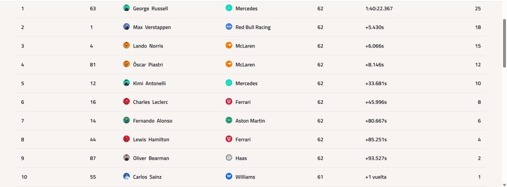 En tanto, el actual líder del campeonato, el australiano Oscar Piastri (McLaren), remató en la cuarta posición, mientras que el debutante italiano Andrea Kimi Antonelli (Mercedes) finalizó quinto. Además, el monegasco Charles Leclerc (Ferrari) llegó en la sexta posición, y el español Fernando Alonso (Aston Martin) remató séptimo.