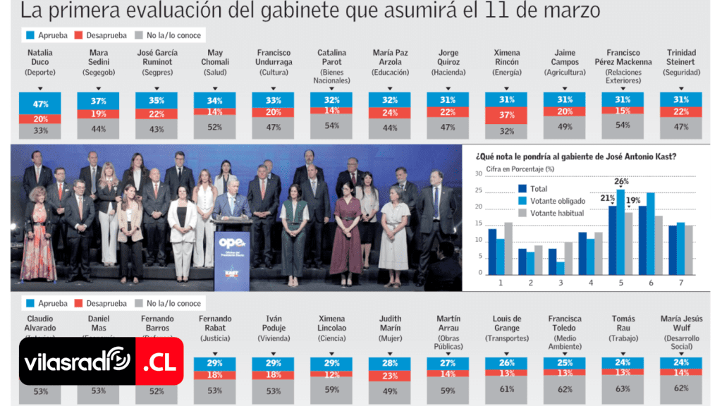 A pocas semanas del cambio de mando, el equipo de José Antonio Kast enfrenta una débil validación ciudadana. Según un reciente estudio de Panel Ciudadano UDD, ningún futuro ministro logra superar el 50% de aprobación. La medición revela que la desaprobación general ronda el 30%, mientras un 84% de la población admite no haber escuchado ni leído sobre el gabinete designado.