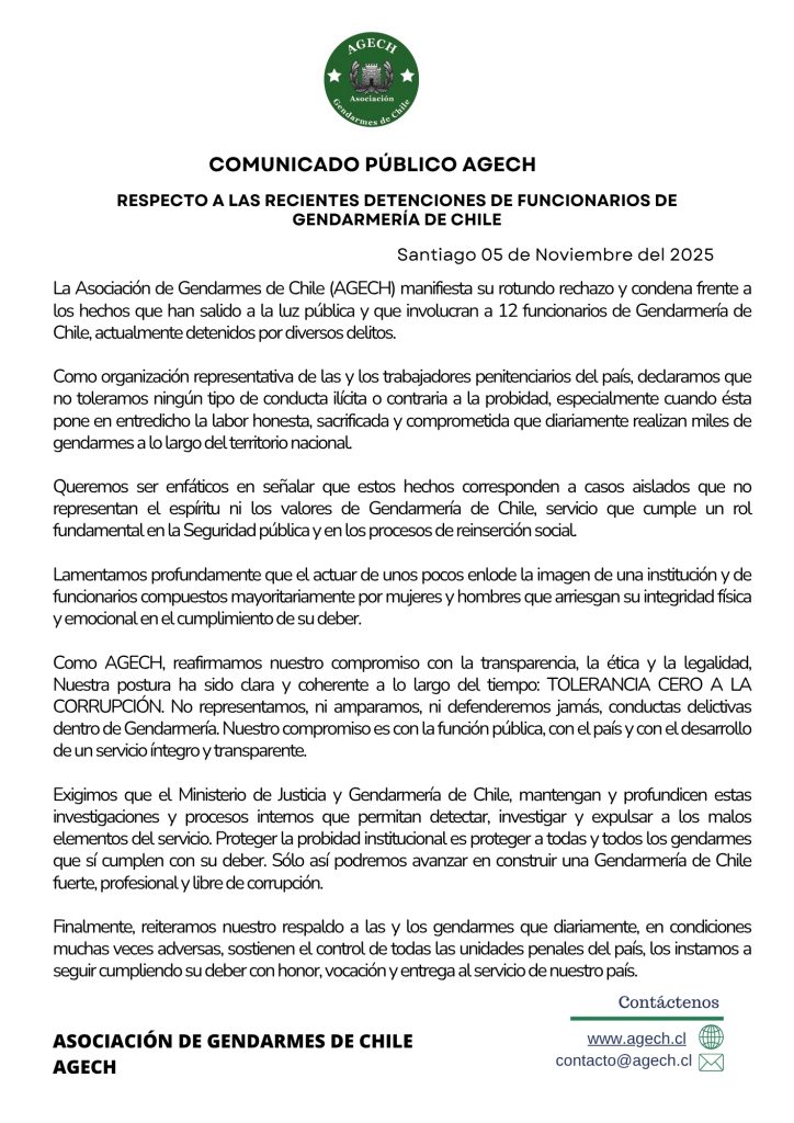 Frente a la gravedad de los hechos, la Asociación de Gendarmes de Chile (AGECH) emitió un rotundo comunicado, condenando la conducta de los implicados y reafirmando su compromiso con la probidad institucional.