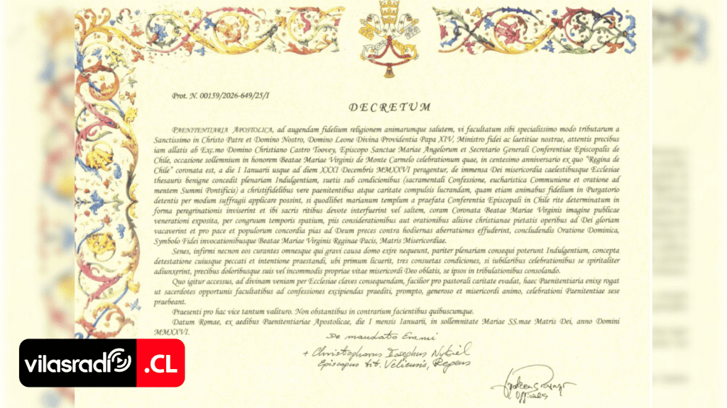 Bajo la autoridad del Papa León XIV, el documento faculta a la Conferencia Episcopal de Chile (CECh) para impartir la Bendición Papal en las celebraciones marianas. Cristian Castro Toovey, Obispo y secretario general de la CECh, sostuvo que este beneficio representa un signo de gratitud por el siglo de la Patrona. “La Indulgencia Plenaria es la remisión ante Dios de la pena temporal por los pecados, ya perdonados en cuanto a la culpa, que un fiel dispuesto y cumpliendo determinadas condiciones, consigue por mediación de la Iglesia”, explicó el prelado sobre el significado de este don.