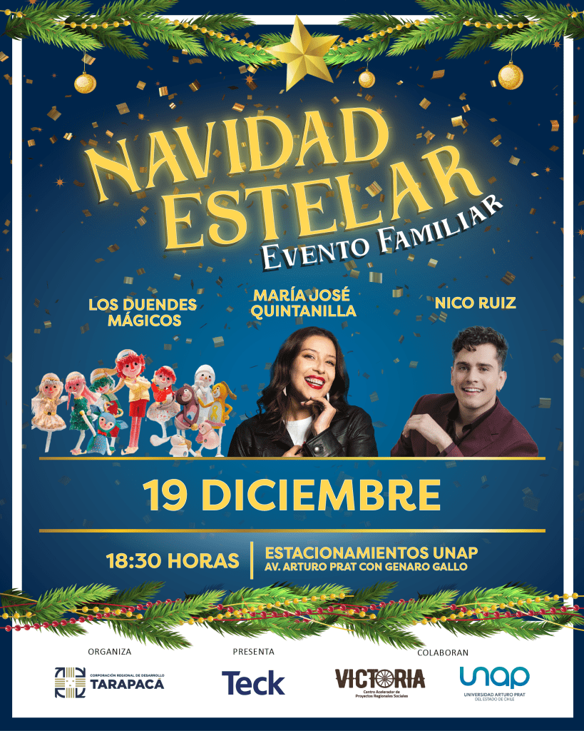 El espectáculo gratuito Navidad Estelar tendrá HOY su última jornada en el estacionamiento de la Universidad Arturo Prat, desde las 18:30 horas. El show incluirá la presentación infantil Mi Duende Mágico, seguida del cantante nacional Nico Ruiz y el cierre a cargo de María José Quintanilla. La actividad, abierta a toda la comunidad, se extenderá hasta aproximadamente las 22:30 horas y busca entregar música, cultura y entretención familiar sin costo.