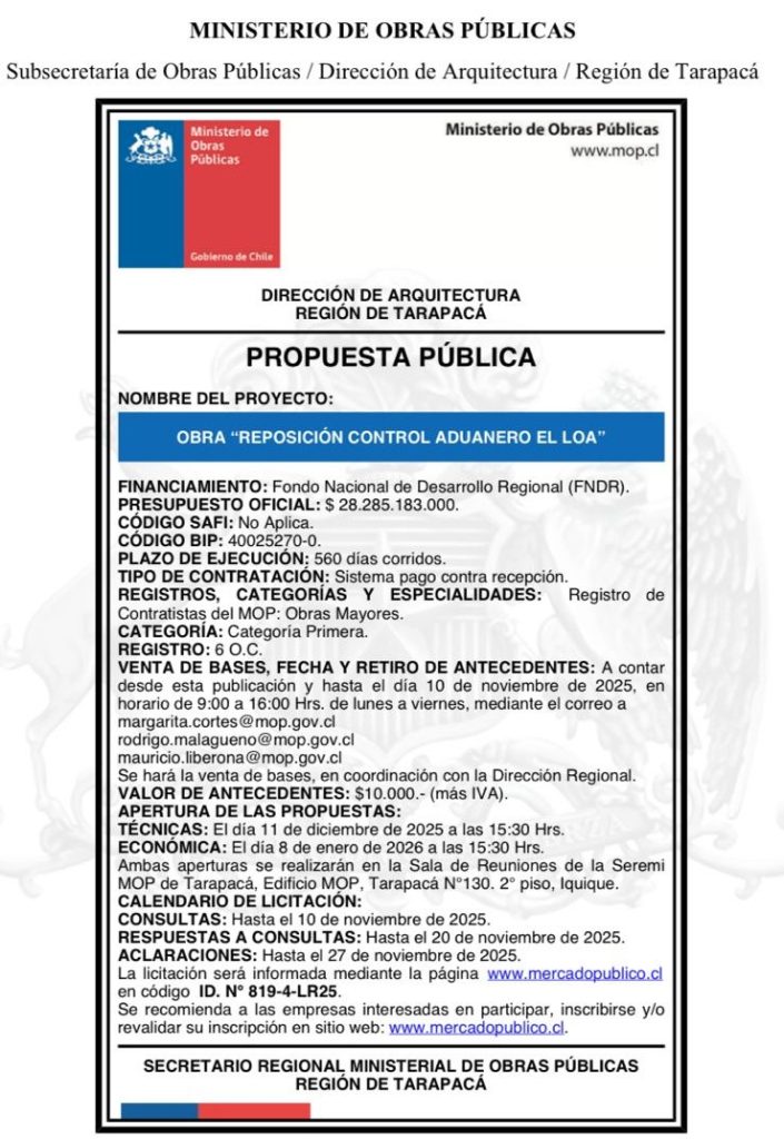 Este jueves 16 de octubre la Dirección de Arquitectura de Tarapacá publicó en el Diario Oficial la propuesta pública con el proyecto “Reposición Control Aduanero El Loa”, que tiene un financiamiento del Fondo Nacional de Desarrollo Regional (FNDR).