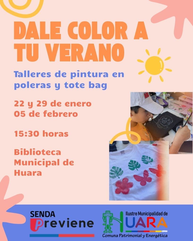 Respecto a la amplia oferta recreativa y educativa, Michelle Miranda, coordinadora de talleres de Huara, manifestó que el objetivo es alejar a los jóvenes de las pantallas con propuestas innovadoras como el taller de Mitos y Leyendas, que se imparte los miércoles y jueves de 17:30 a 19:00 horas en la Biblioteca Municipal. Además, destacó que, gracias a la Oficina Local de la Niñez, los menores ya están participando en cursos de Masterchef, cine, jornadas de piscina y diversas clases de artes manuales, como la personalización de tote bags y poleras los jueves a las 15:30 horas.