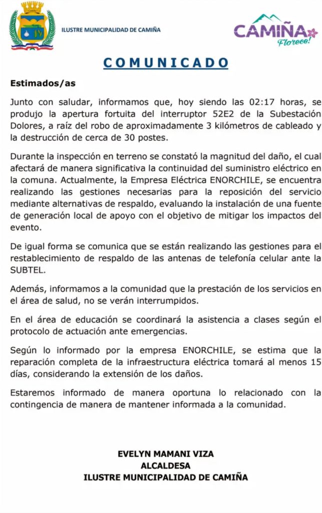 La situación ha causado enorme molestia entre los vecinos y autoridades locales, quienes califican el hecho como un acto inaceptable y de alto impacto para la comunidad. La Ilustre Municipalidad de Camiña, encabezada por la alcaldesa Evelyn Mamani Viza, exigió respuestas y medidas concretas para reforzar la seguridad en las instalaciones eléctricas y evitar que hechos similares se repitan.