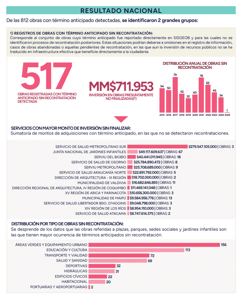 La CGR ha puesto el foco en estos proyectos paralizados y ha instado a los servicios públicos a que informen pormenorizadamente acerca del estado de las obras con registros de término anticipado y la actualización de la información registrada en el sistema SISGEOB.