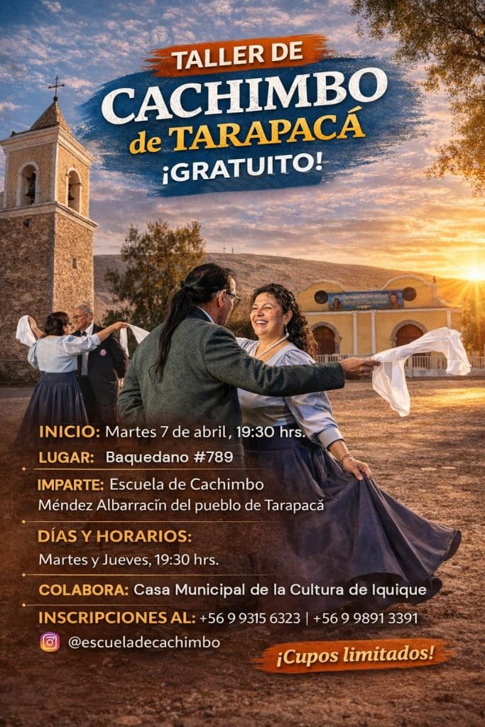 La Escuela de Cachimbo Méndez Albarracín del Pueblo de Tarapacá extendió una invitación abierta a toda la comunidad para participar en un nuevo ciclo formativo de esta danza emblemática. El curso, que es completamente gratuito, tiene como objetivo principal difundir y preservar el Cachimbo de la Quebrada de Tarapacá, reconocido como el único baile regional con el título de Patrimonio Inmaterial. Las clases están diseñadas para personas de todas las edades, sin necesidad de tener experiencia previa en el baile.
