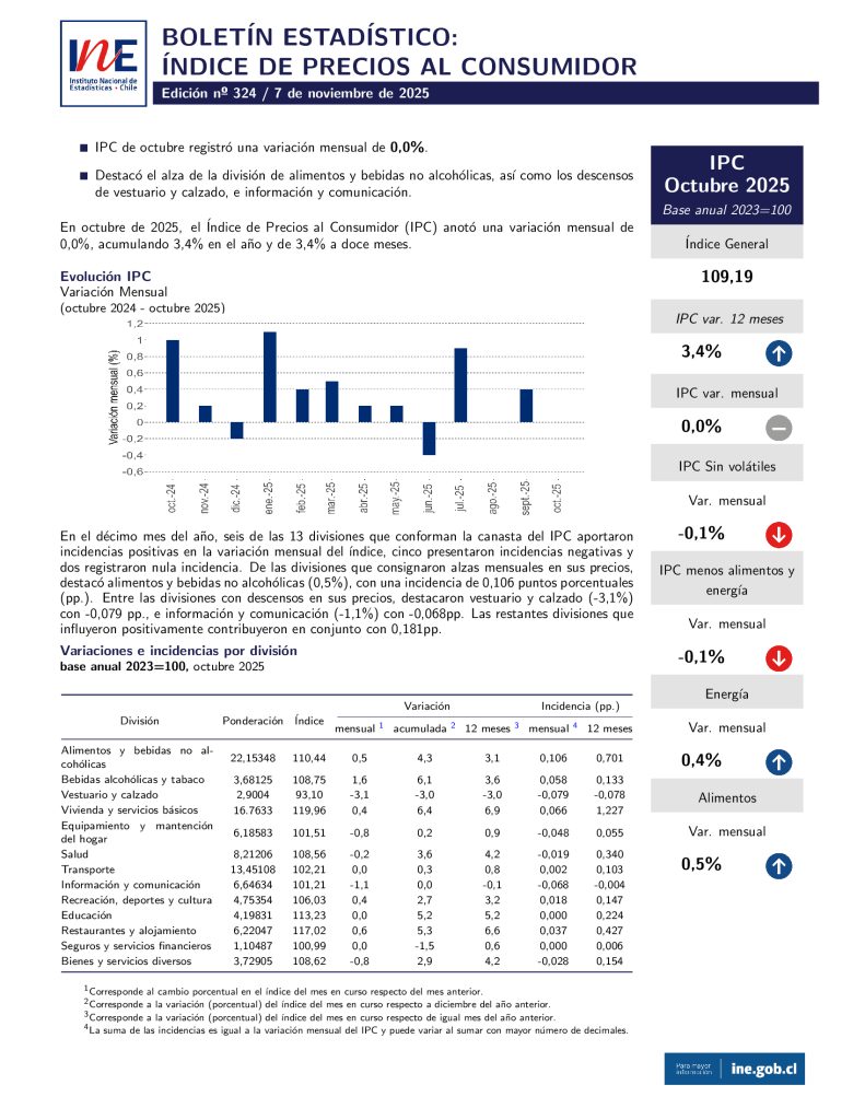 Una sorpresa positiva trajo el Índice de Precios al Consumidor (IPC) de octubre, que registró una variación mensual de 0%, ubicando la inflación anual en 3,4%, su nivel más bajo desde abril de 2021, según informó el Instituto Nacional de Estadísticas (INE).