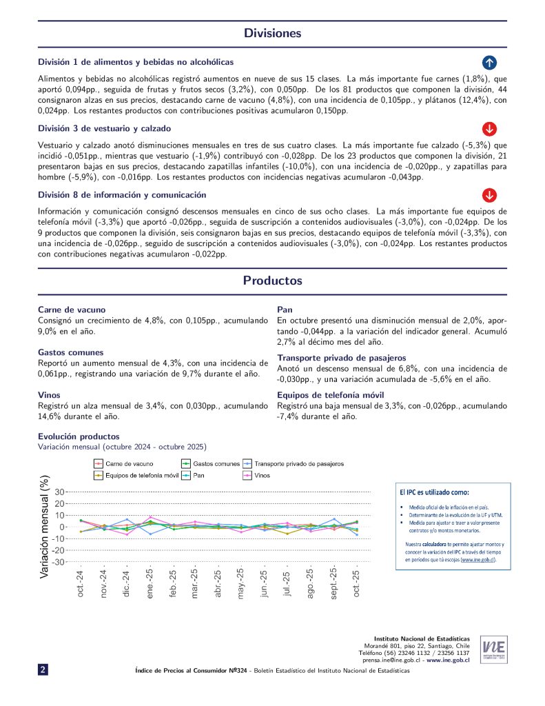A nivel de productos, el INE destacó los incrementos en los precios de la carne de vacuno (4,8%), los gastos comunes (4,3%) y el vino (3,4%). Por otro lado, se registraron bajas en el pan (-2%), el transporte privado de pasajeros (-6,8%) y los equipos de telefonía móvil (-3,3%).