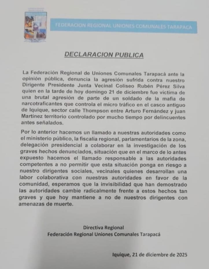La Federación Regional de Uniones Comunales de Tarapacá no tardó en publicar una dura declaración: