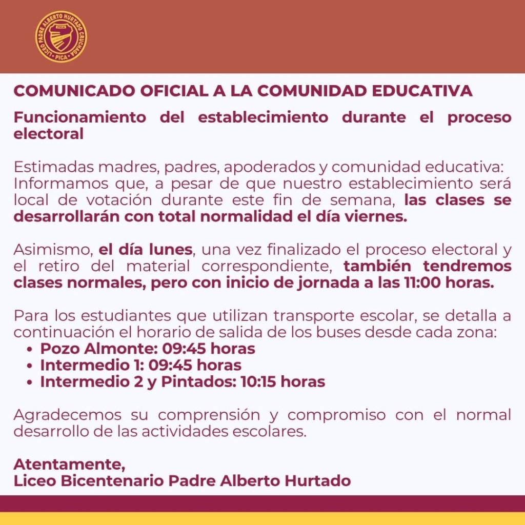 El Liceo Bicentenario Padre Alberto Hurtado de Pica informó a su comunidad educativa que las clases se desarrollarán con total normalidad este viernes, a pesar de que el recinto será utilizado como local de votación durante el proceso electoral de este fin de semana.