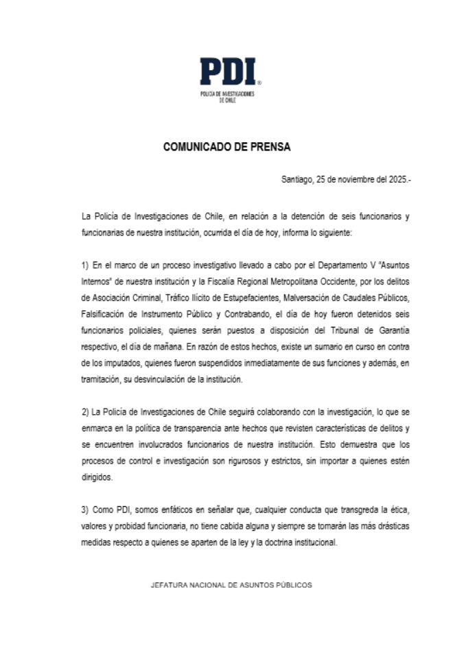 “No existe tolerancia para quienes violen la ética, la probidad o la doctrina institucional”, declaró la PDI en un mensaje que buscó marcar distancia de los acusados.