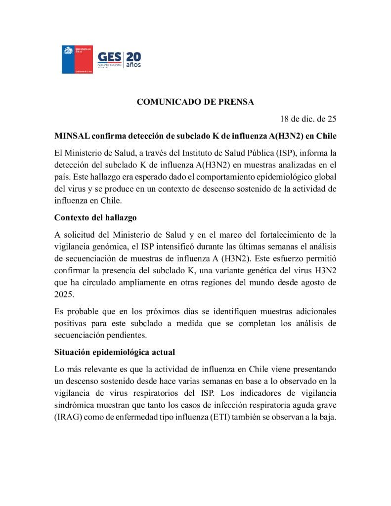 Según explicó la autoridad sanitaria, el hallazgo se concretó luego de que el ISP intensificara la secuenciación genética de muestras respiratorias, un proceso que permitió constatar la presencia de esta variante, la cual ya circula desde mediados de 2025 en distintas regiones del mundo. Desde el Ministerio no descartan que aparezcan nuevos casos asociados al subclado K en los próximos días, a medida que finalicen los análisis pendientes.