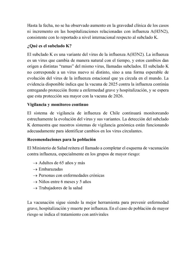 La autoridad sanitaria informó que continuará entregando actualizaciones a la ciudadanía a través de sus canales oficiales ante cualquier cambio relevante en la evolución de la influenza en el país.