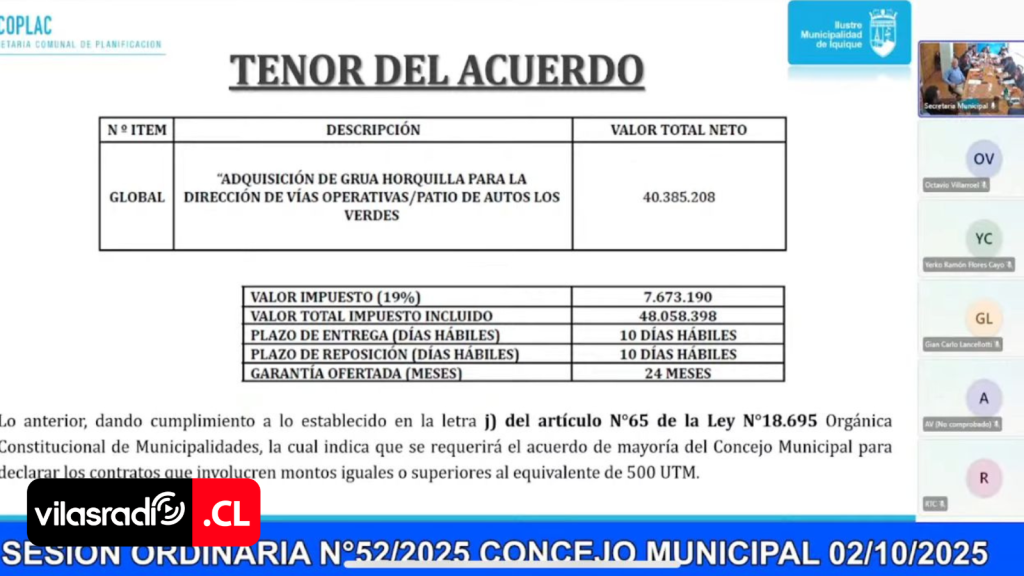 En concreto, el concejo aprobó la adjudicación a Autoque SPA, cerrando el acuerdo de parte del presidente de la sesión, “se autoriza al señor alcalde a declarar adjudicada la propuesta pública N°150/2024… por un valor de $48.058.398 impuestos incluidos, con una garantía de 24 meses”.