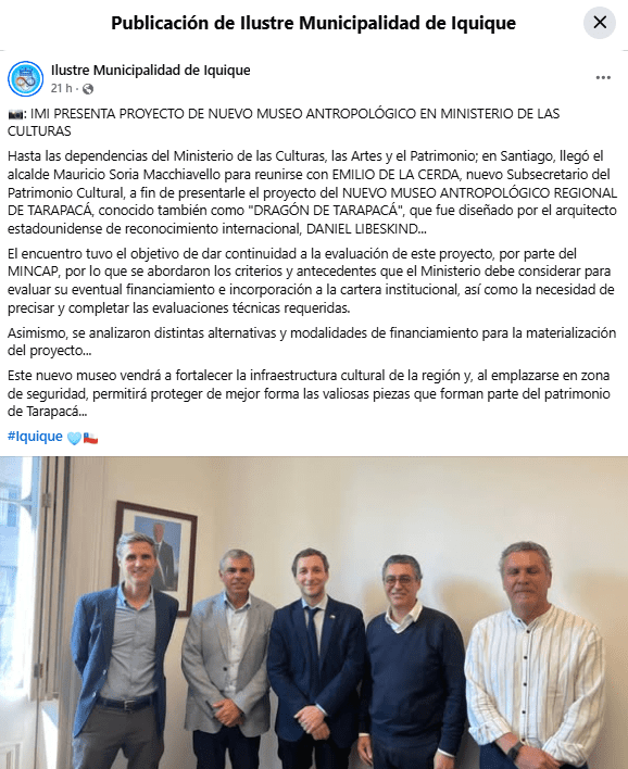 A este escenario se suma un hito reciente: a fines de marzo de 2026, el alcalde presentó ante el Ministerio de las Culturas el diseño final del museo —ya financiado en su etapa técnica— con el objetivo de gestionar los recursos necesarios para iniciar la construcción en dicho terreno, que hoy ya está disponible y a la espera de financiamiento para concretar la obra.