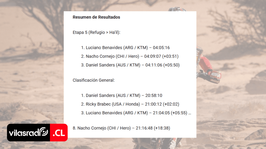 El piloto iquiqueño, José Ignacio «Nacho» Cornejo, protagonizó una espectacular remontada en la quinta etapa del Rally Dakar 2026, logrando el segundo lugar en el trayecto hacia Ha’il. Con una navegación quirúrgica y una gestión experta del desgaste de su máquina, el chileno superó los 356 kilómetros de especial, caracterizados por un terreno mixto de arena y piedras, consolidándose nuevamente como uno de los contendientes más fuertes de la competencia más dura del mundo.