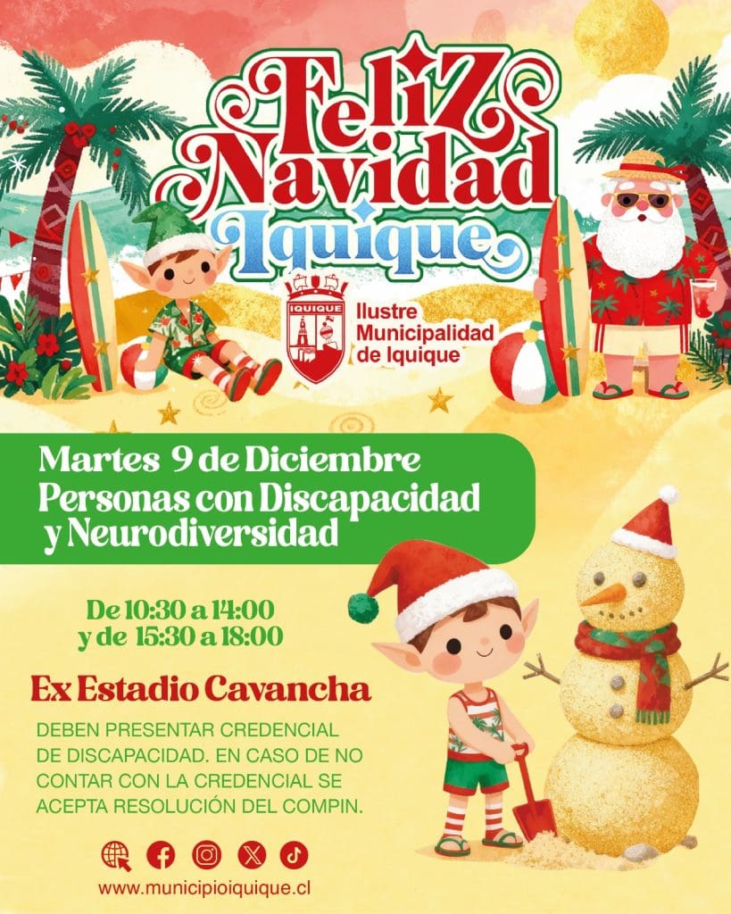 La Ilustre Municipalidad de Iquique recuerda que hoy, martes 9 de diciembre, se está realizando la jornada especial de entrega de regalos de Navidad 2025 destinada a personas con discapacidad y neurodiversidad de la comuna.