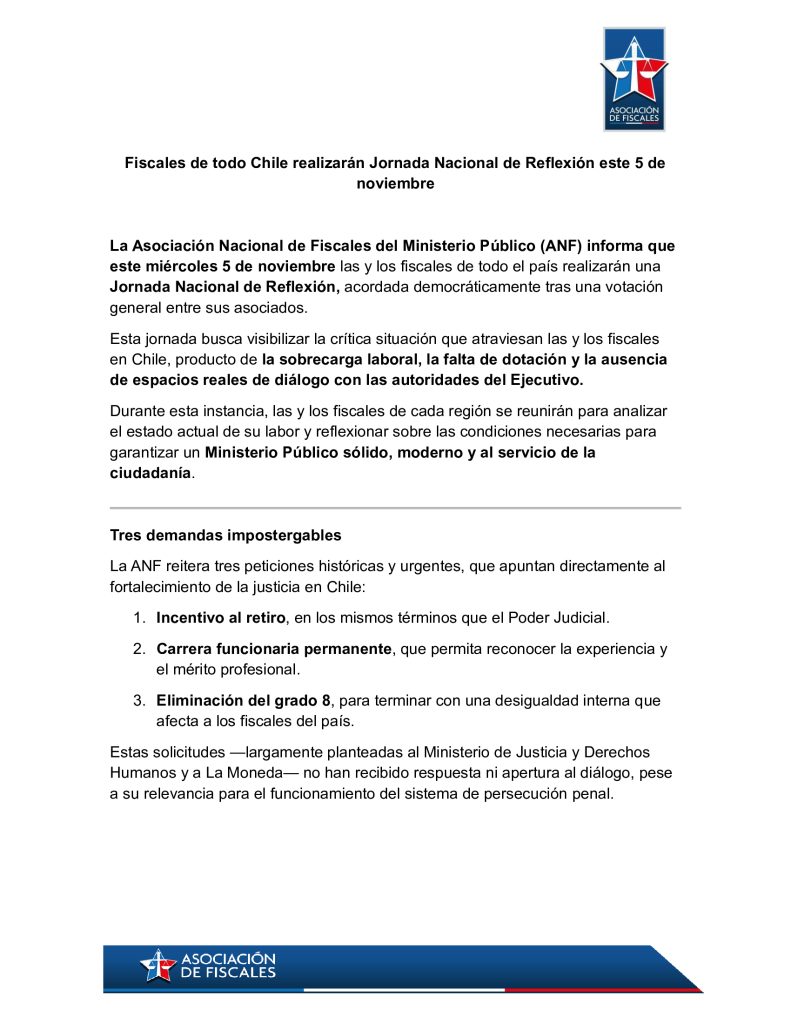 La Asociación Nacional de Fiscales (ANF) anunció una Jornada Nacional de Reflexión y movilización para este miércoles 5 de noviembre, instancia en la que fiscales de todo el país realizarán pausas laborales y puntos de prensa para visibilizar las precarias condiciones en que desempeñan su labor y exigir respuestas concretas al Gobierno.