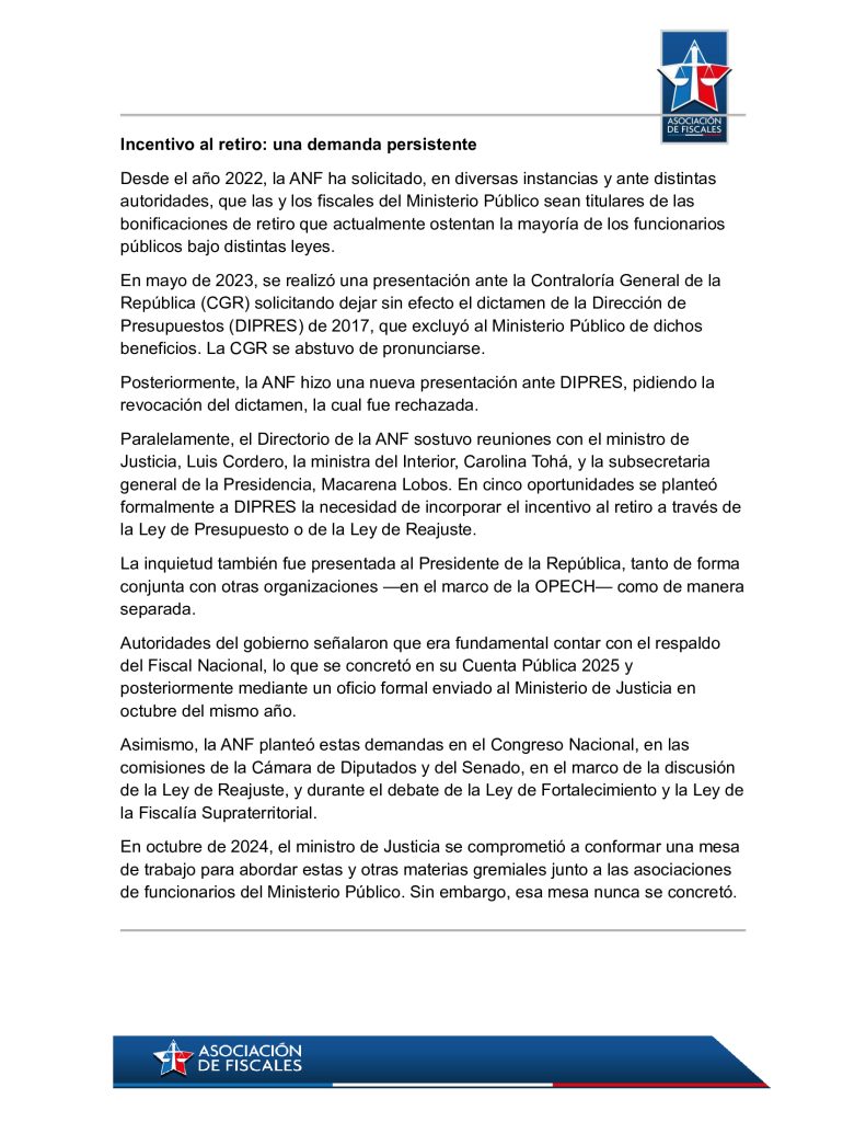 Desde 2022, la ANF ha presentado solicitudes ante la Contraloría General de la República, la Dirección de Presupuestos (Dipres) y diversas autoridades, incluyendo los ministerios de Justicia e Interior, además de gestiones directas con el Presidente de la República.