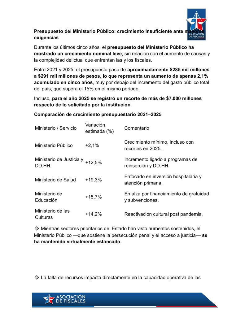 El comunicado de la ANF subraya que el presupuesto del Ministerio Público ha tenido un crecimiento acumulado de apenas 2,1% entre 2021 y 2025, muy por debajo del aumento promedio del gasto público nacional, que supera el 15% en el mismo período.