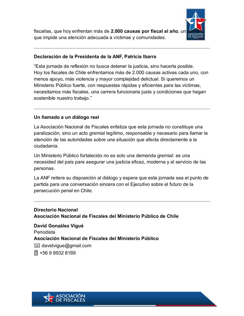 En Santiago, el acto central se desarrollará en el Centro de Justicia (Av. Pedro Montt 1606), encabezado por la presidenta Patricia Ibarra. La ANF enfatizó que se trata de una movilización reflexiva y no de paralización de funciones, destinada a abrir un espacio de debate sobre la situación institucional del Ministerio Público.