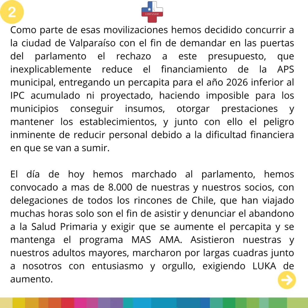 “La Salud Primaria es un tesoro nacional y debemos defenderla”, señaló el comunicado emitido por la organización, que reafirmó su disposición a continuar las gestiones para asegurar un financiamiento justo y sostenido en la ley de Presupuestos 2026.
