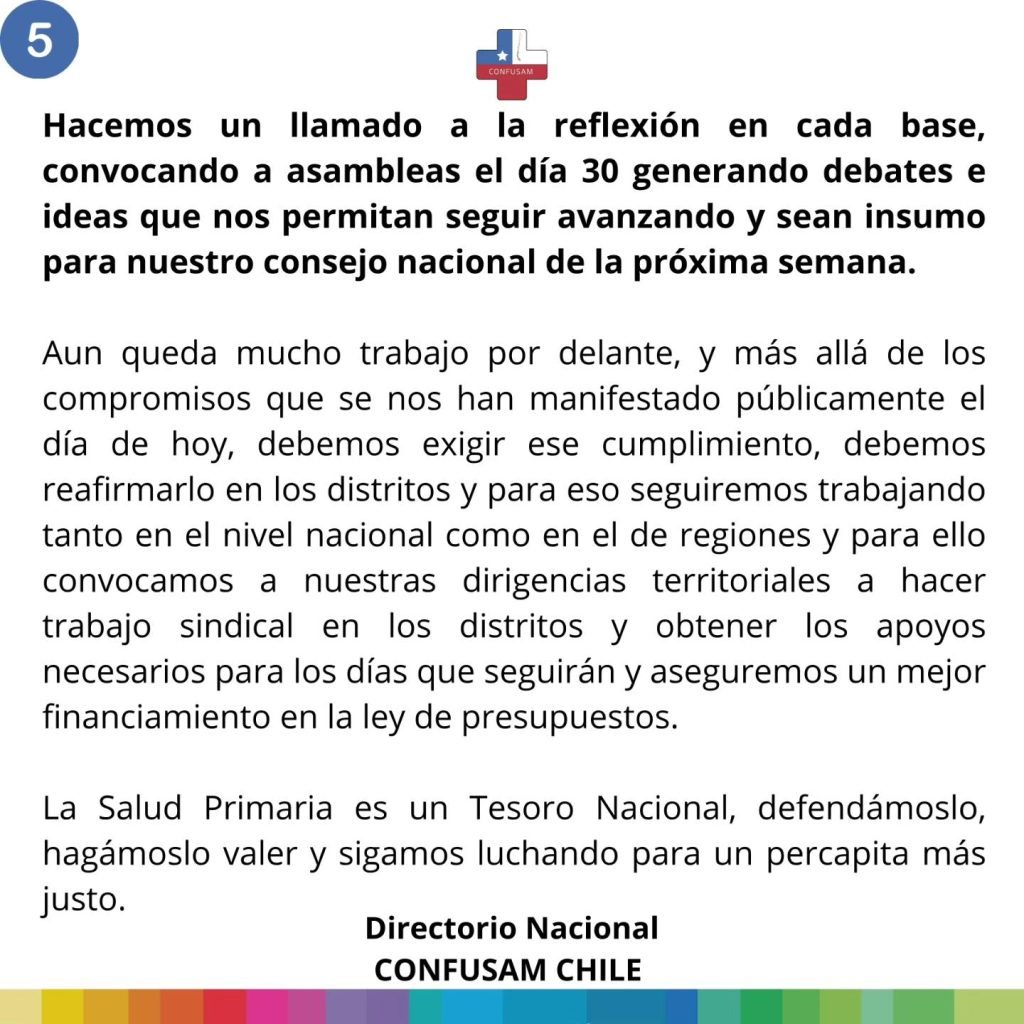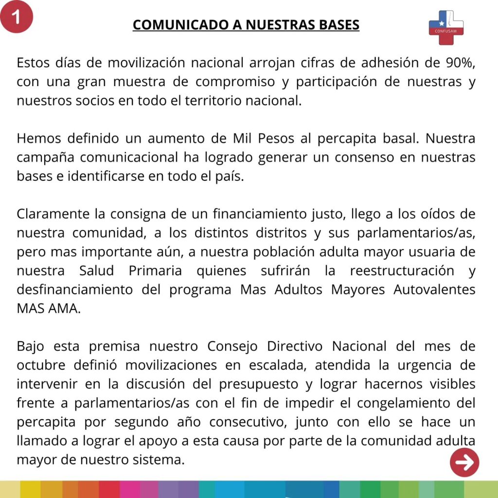 El Directorio Nacional de Confusam informó que el próximo 6 de noviembre se reunirá para definir los pasos a seguir y nuevas estrategias de movilización. Asimismo, convocó a sus bases a realizar asambleas territoriales durante esta jornada para reflexionar sobre los avances y mantener la unidad del movimiento.