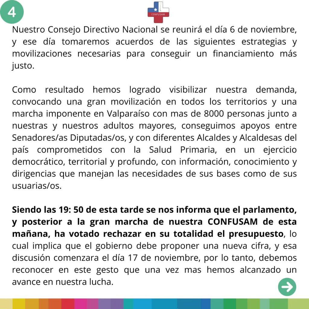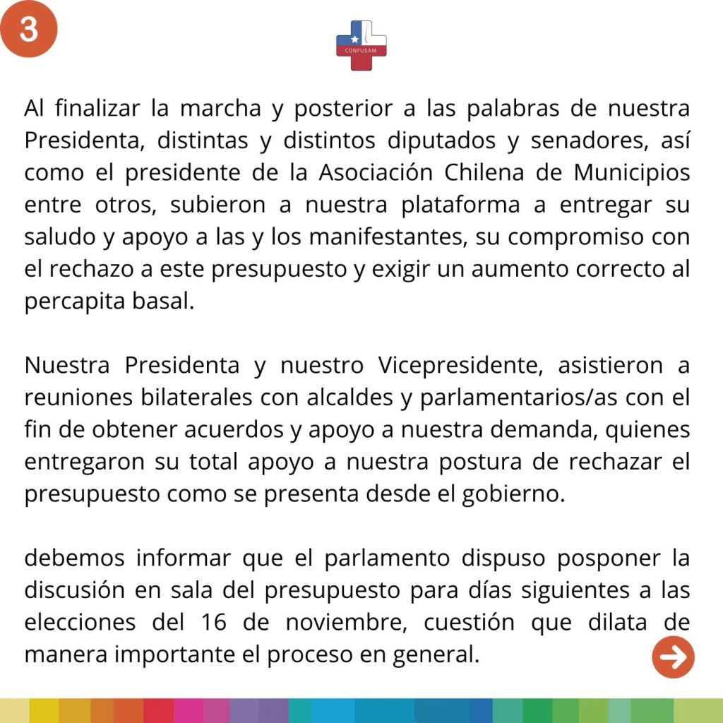 Tras la manifestación, el Congreso Nacional decidió rechazar la partida presupuestaria correspondiente a la Salud Municipal, lo que obligará al Gobierno a presentar una nueva propuesta el próximo 17 de noviembre, luego de las elecciones municipales.