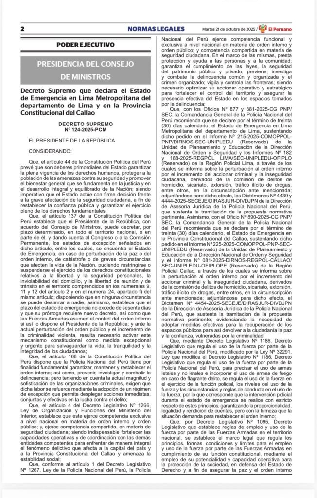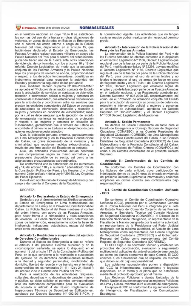 El decreto, publicado en El Peruano, establece que el control del orden interno estará en manos de la Policía, pero con apoyo directo del Ejército, que podrá patrullar las calles, intervenir zonas de conflicto e incluso participar en operativos contra manifestaciones.