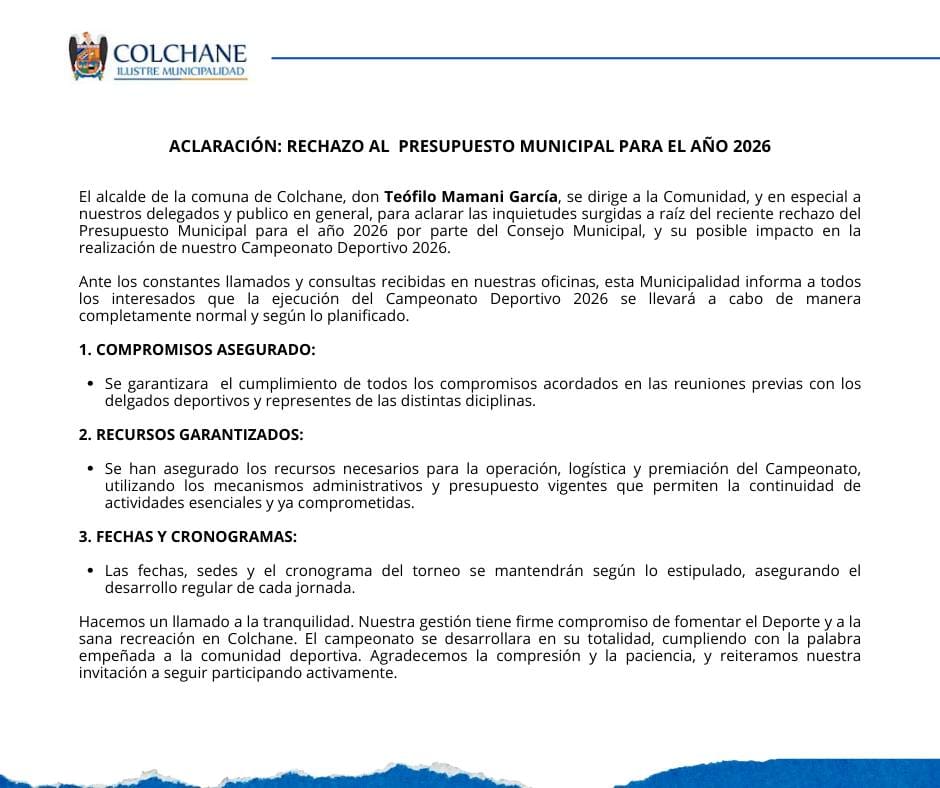 Tras el rechazo del Presupuesto Municipal 2026, ocurrido durante la Sesión Ordinaria N°38 del Concejo Municipal de Colchane, la Ilustre Municipalidad emitió un comunicado dirigido a la comunidad y, en especial, a los delegados y participantes del Campeonato Deportivo 2026, con el fin de aclarar las dudas surgidas respecto a la continuidad del evento.