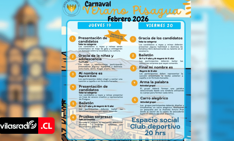 El puerto histórico de Pisagua se prepara para vivir una de sus celebraciones más vibrantes del año. Bajo la organización de la Ilustre Municipalidad de Huara y la Junta de Vecinos N°2, el Carnaval Verano Pisagua 2026 promete dos noches inolvidables de encuentro comunitario y alegría. Las actividades se concentrarán en el Espacio Social Club Deportivo a partir de las 20:00 horas.