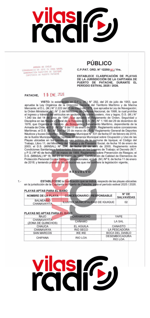 Este documento oficial establece la clasificación de playas para el período estival 2025–2026, y en él se consigna expresamente a Chanavayita como playa apta para el baño, quedando bajo la responsabilidad directa de la Ilustre Municipalidad de Iquique, con la exigencia de dos salvavidas operativos.