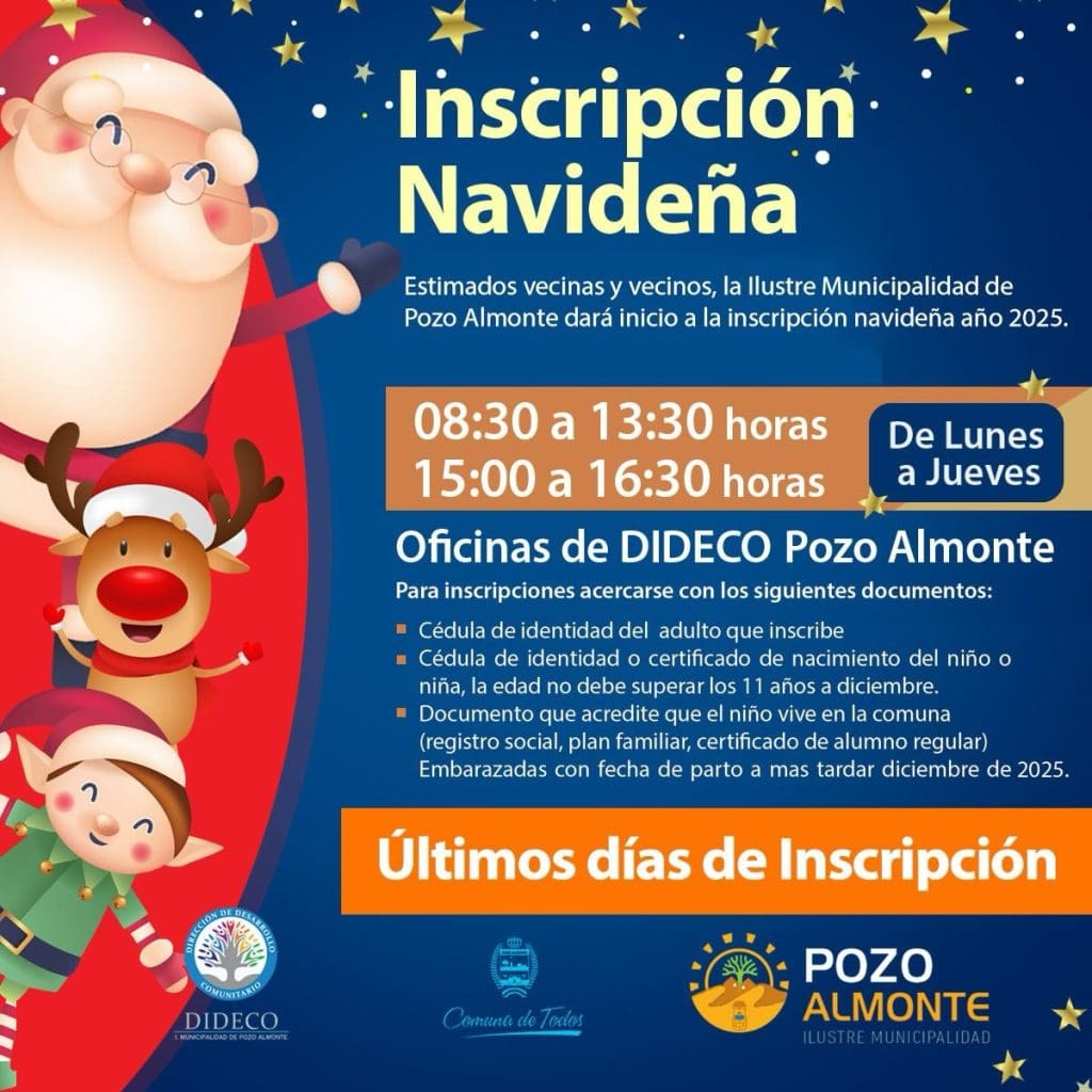 La Ilustre Municipalidad de Pozo Almonte anunció que esta semana corresponde a los últimos días de inscripción para participar en la tradicional entrega de regalos navideños 2025, iniciativa que cada año beneficia a niños, niñas y embarazadas de la comuna.