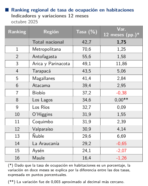 Además, la tasa de ocupación en habitaciones a nivel regional se situó en 43,5%, lo que significó una expansión de 5,06 puntos porcentuales (pp.) en doce meses, reflejando una mayor utilización de la capacidad hotelera.