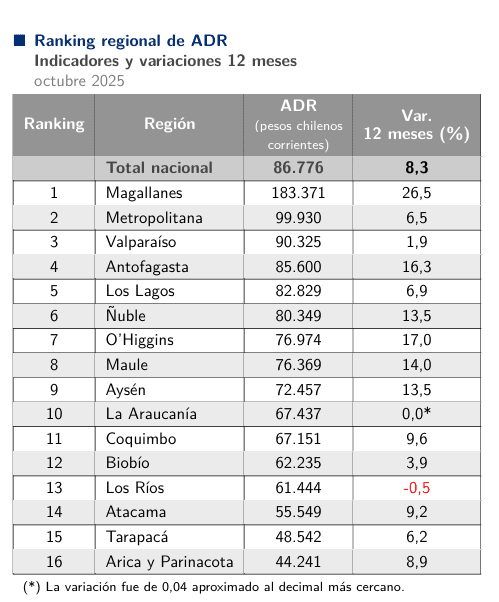 Por su parte, el ADR (Tarifa Promedio Diaria) regional se ubicó en $ 48.542 por habitación, lo que implicó un crecimiento interanual del 6,2%. Sin embargo, este valor posiciona a Tarapacá en el puesto 15 a nivel nacional, quedando como la penúltima región en esta métrica. El valor de Tarapacá está muy por debajo del promedio nacional, que alcanzó los $86.776 (con un aumento del 8,3%). Las tarifas más altas se consignaron en regiones como Magallanes ($183.371) y Metropolitana ($99.930).