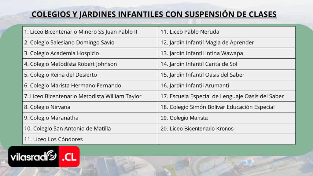 En concreto y de acuerdo a la información recabada por este medio hoy se mantienen las clases suspendidas en 20 establecimientos educacionales (jardines infantiles, colegios y liceos) y se han habilitado 27 puntos de distribución de agua en diferentes sectores de la comuna para garantizar el abastecimiento básico del suministro a la comunidad.