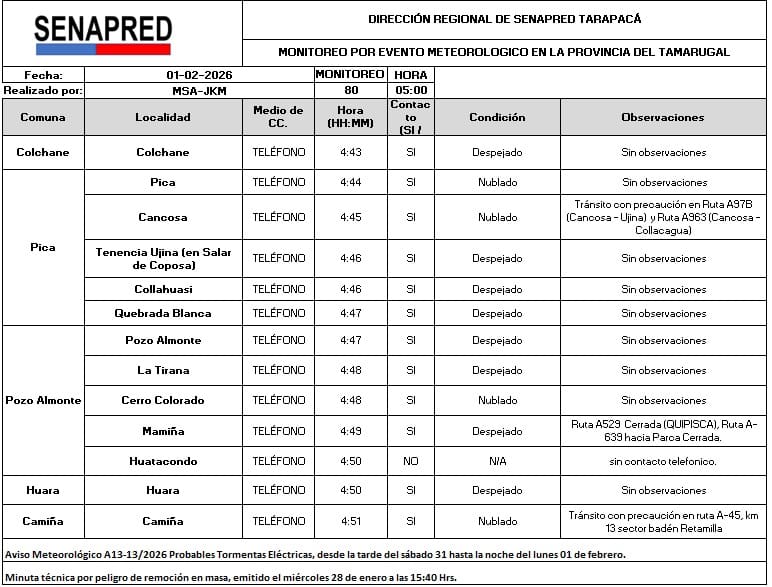 El detalle fue confirmado a las 05:00 horas por la Dirección Regional de SENAPRED Tarapacá, tras un monitoreo telefónico realizado en distintas localidades de la provincia, en el marco del Aviso Meteorológico A13-13/2026, que advierte tormentas eléctricas con precipitaciones aisladas entre la tarde del sábado 31 de enero y la noche de este lunes 1 de febrero.