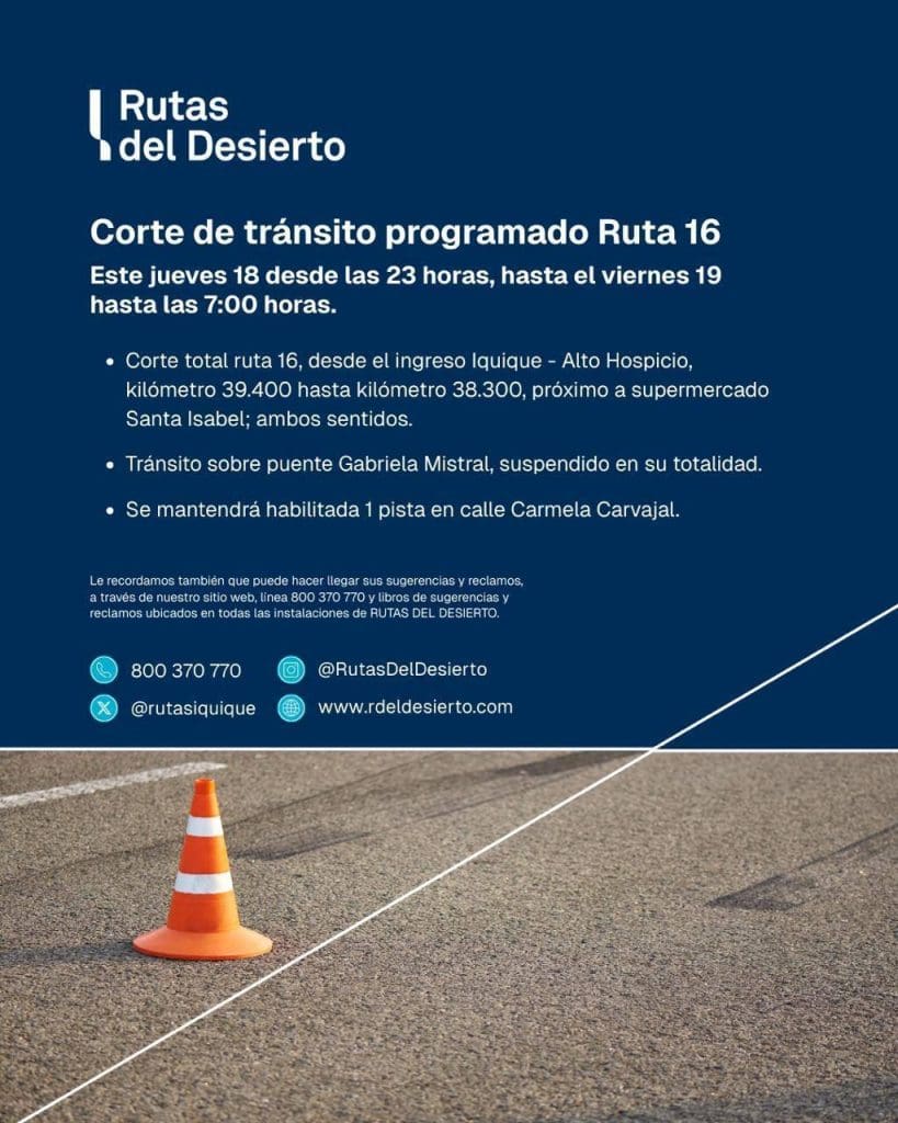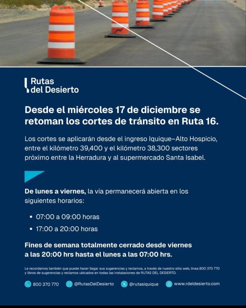 La concesionaria Rutas del Desierto anunció que a partir del miércoles 17 de diciembre se retomarán los cortes programados de tránsito en la Ruta 16, específicamente en el tramo que conecta Iquique con Alto Hospicio, entre los kilómetros 39,400 y 38,300, sector cercano a La Herradura y al supermercado Santa Isabel.