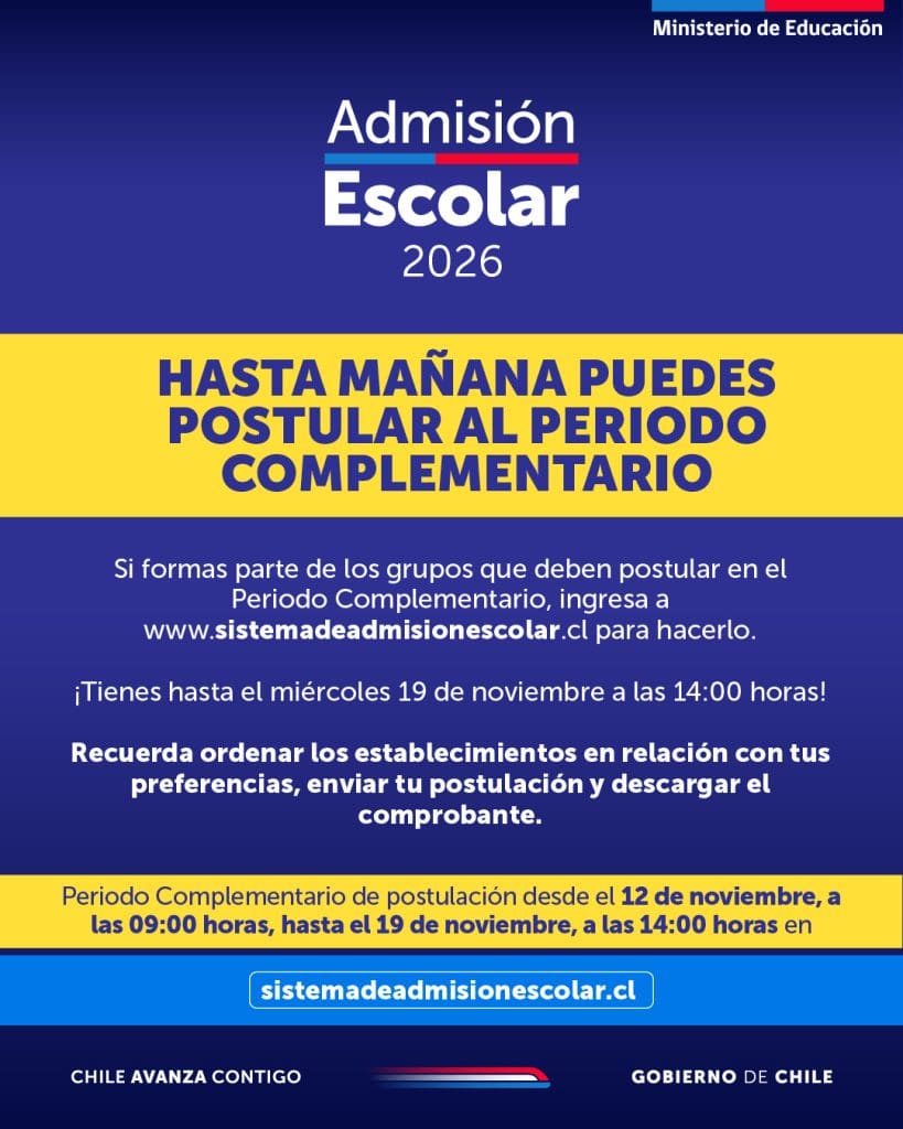 La cuenta regresiva ya comenzó y miles de familias en Chile viven, nuevamente, la tensión del Sistema de Admisión Escolar (SAE). Este miércoles 19 de noviembre, a las 14:00 horas, expira definitivamente el Periodo Complementario de Postulación 2026, la última ventana para quienes, por distintas razones, aún no han logrado asegurar un cupo para el próximo año escolar.