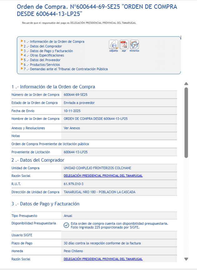 El documento, que declara disponibilidad presupuestaria y forma parte del presupuesto del Complejo Fronterizo Colchane para el período 2025-2026, establece un plazo de pago de 30 días, además de confirmar que el proveedor adjudicado se encuentra habilitado para contratar con el Estado.