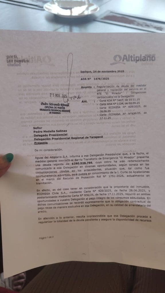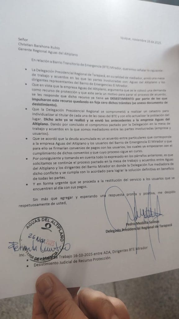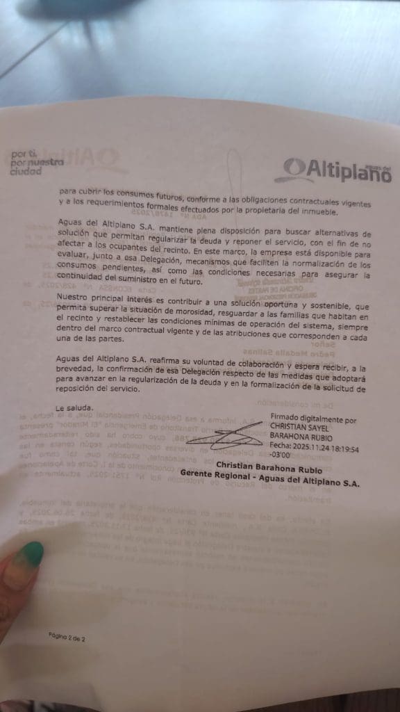Según relatan los vecinos, el delegado había asegurado —documento mediante— que el suministro se restituiría y que todos los hogares contarían con medidores operativos. Incluso, que la Delegación asumiría ciertos compromisos por su calidad de arrendataria del terreno: arriendo y eventuales costos asociados.