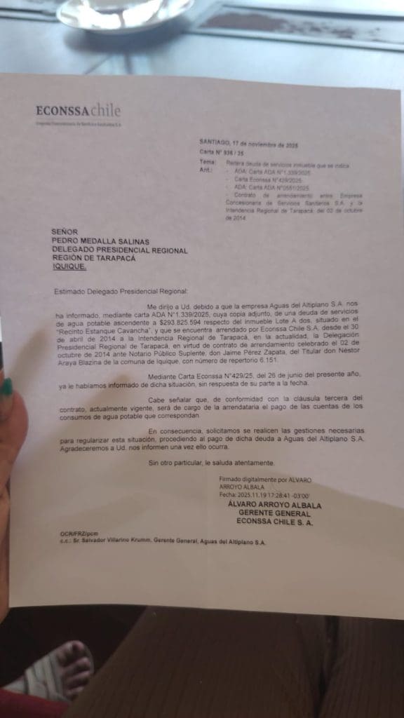 Aun así, la empresa habría cambiado su postura, apuntando a una carta enviada por ECOPSA, dueña del terreno, que señala que cualquier deuda asociada al inmueble debe ser asumida por el arrendatario… en este caso, la Delegación Presidencial.