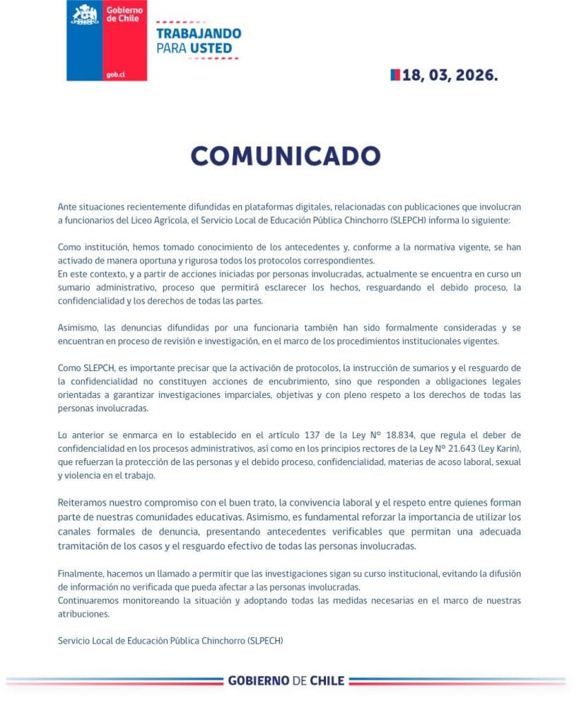 A través de un comunicado oficial emitido este miércoles 18 de marzo, el Servicio Local de Educación Pública (SLEP) Chinchorro confirmó el inicio de acciones legales y administrativas ante las denuncias que involucran a funcionarios del Liceo Agrícola. La institución informó que ya se encuentra en curso un sumario administrativo, proceso que busca esclarecer los hechos bajo el resguardo del debido proceso y la confidencialidad de las partes.