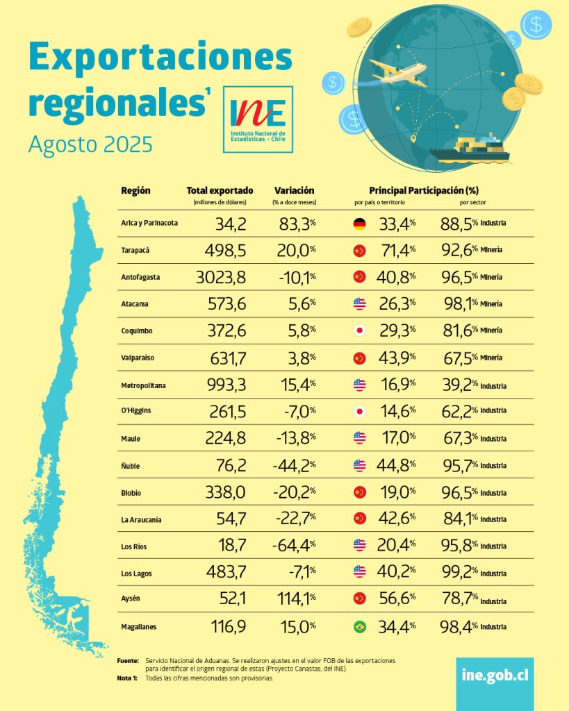 Nuevamente el Instituto Nacional de Estadísticas de Chile (INE) entregó el Boletín de Exportaciones correspondiente al mes de agosto 2025, en el cual se dio a conocer el detalle de cada región en esta materia donde Tarapacá exportó US$498,5 millones de dólares, generando un crecimiento en esta materia.