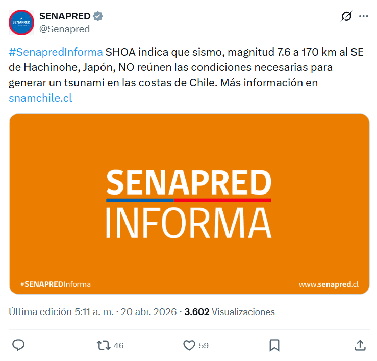 Tras el evento, el Servicio Hidrográfico y Oceanográfico de la Armada (SHOA) realizó un análisis de los parámetros técnicos, confirmando que las características del sismo no reúnen las condiciones necesarias para generar una amenaza de tsunami en el litoral chileno. El organismo precisó que mantendrá el monitoreo preventivo, aunque descarta cualquier impacto para nuestras costas.